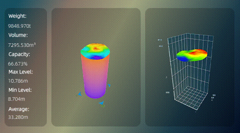 High-Precision 3D Modeling: Raw data is processed via AI and 3D point cloud conversion to reconstruct the material’s form in real time. The system calculates min/max levels, volume, and mass with distance accuracy of ±2mm.